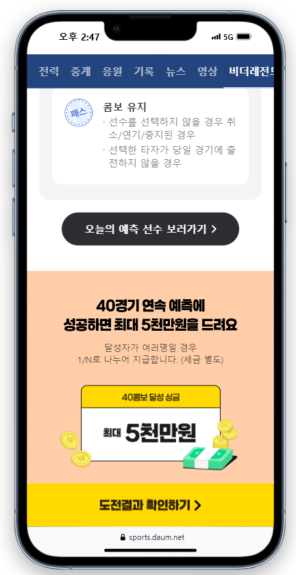 - 지정 경기: 31콤보 이상 달성 시, 스포츠투아이가 지정한 특정 경기의 타자만 선택 가능합니다. 이는 난이도를 높이는 요소입니다.