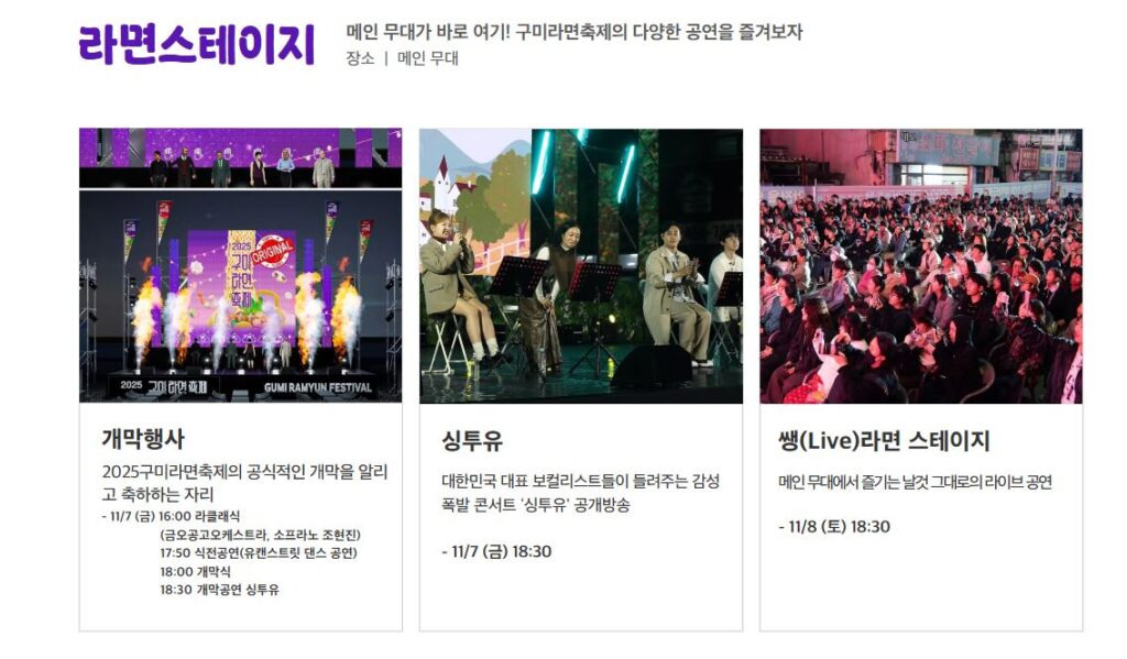 - 라면스테이지: 메인 무대에서 보컬리스트·밴드 등의 라이브 공연이 펼쳐집니다. 예컨대 11/7(금) 18:30부터 공개방송형 콘서트 예정. 2025 구미라면축제+1