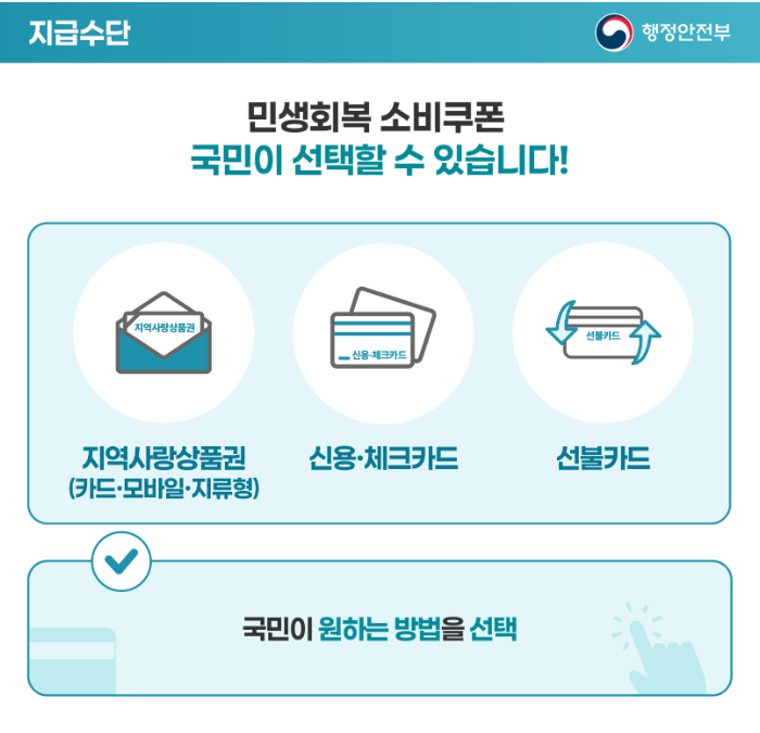 - 지급 방식 선택(지역사랑상품권, 선불카드, 신용·체크카드 포인트).